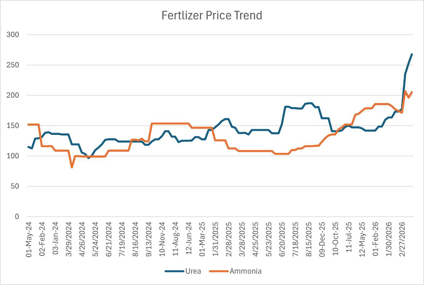 Fertilizer markets present an additional risk. Around 30% of globally traded fertilizer, urea, and ammonia transits the Strait, with the Gulf supplying a large share of global exports. Disruptions have pushed urea prices up by as much as 50% (IFRI, 2026) during the critical March-to-May planting season. This reflects the disruption to roughly one-third of the global fertilizer trade. Farmers are adjusting usage, increasing the likelihood of weaker harvests and higher food prices later in the year.