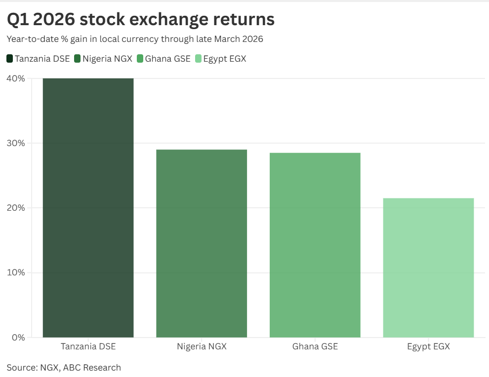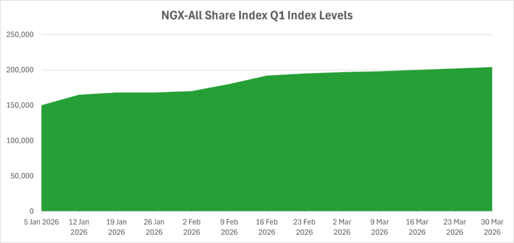 The Nigerian Exchange All-Share Index delivered the most dramatic equity story on the continent in Q1 2026. It started the year at 155,613 points and never looked back.