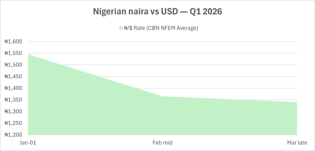 Nigeria’s naira told a nuanced story. It opened the year near ₦1,543/$ (CBN NFEM average), recovered strongly to ₦1,368.5/$ by February, and pushed below ₦1,350/$ in March, its strongest level since May 2024. Nigeria’s external reserves reached $50.45 billion as of February 16, the highest in 13 years, per CBN data, underpinning naira stability.