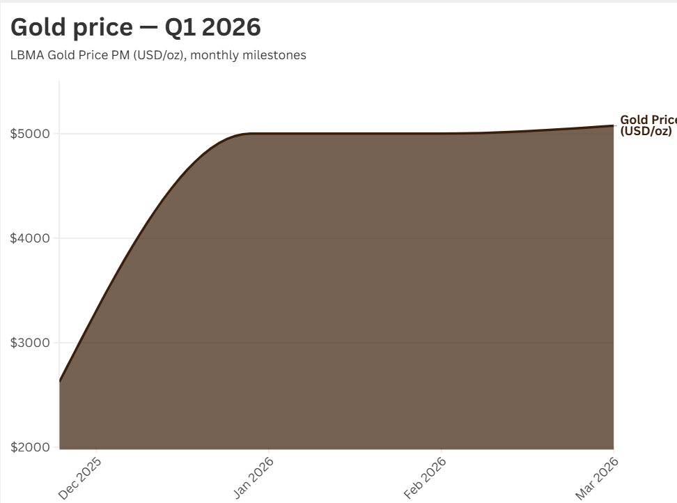 According to the World Gold Council, the LBMA Gold Price PM in USD delivered its strongest January since 1980, surging 14% in the month and closing at $4,982/oz, an all-time high. In February, the price rose another 4.8%, with gold briefly touching $5,000/oz before pulling back. By March, prices remained above the $5,000/oz threshold, supported by geopolitical tensions in the Middle East, safe-haven demand, and a weaker US dollar.