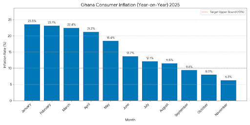 The West African nation’s inflation slowed to 6.3% year-on-year in November, down sharply from the 8.0% recorded in October. This remarkable drop marks the eleventh consecutive month of disinflation, positioning Ghana firmly within its central bank’s medium-term stability band. Ghana Statistical Service (GSS) said on Wednesday.