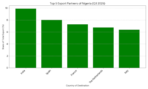 India is Nigeria’s top export partner during the Quarter with 9.90%. share of total exports for the top five destinations.