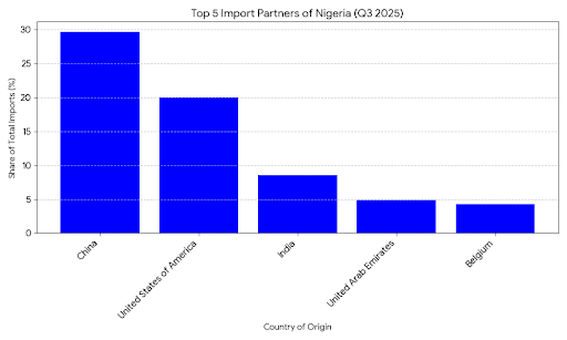 Total imports in Q3 2025 were valued at N16.122 trillion (US$10.86 billion), constituting 41.41% of total trade. The import value saw a 5.51% increase year-on-year.