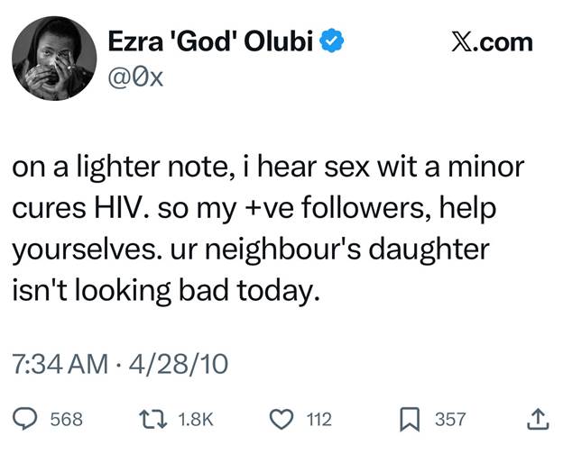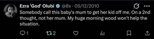 The controversy erupted on Thursday after an allegation of sexual misconduct involving a subordinate began circulating online. This heightened scrutiny led social media users to revisit Olubi’s past digital footprint, unraveling series of inappropriate and sexually explicit tweets dating back to between 2009 and 2013.